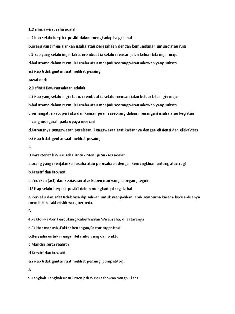 d. Semua jawaban benarPembahasan: Semua faktor yang disebutkan (perubahan selera konsumen, kemajuan teknologi, dan perubahan kebijakan pemerintah) dapat menjadi pemicu munculnya peluang usaha baru.