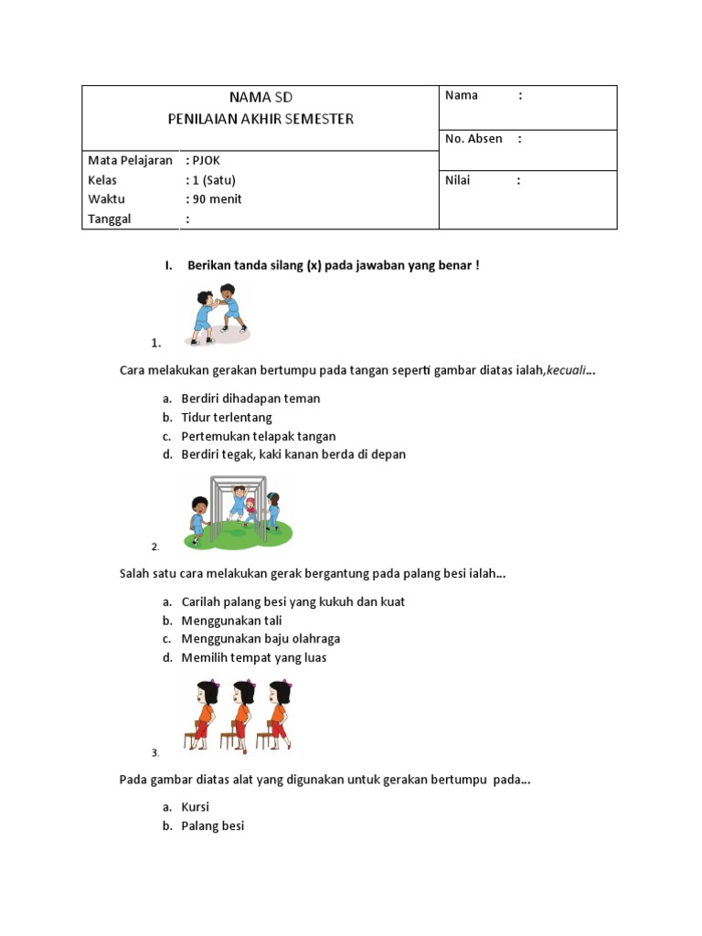 Artikel ini akan menyajikan serangkaian contoh soal yang dirancang untuk menguji pemahaman siswa kelas 1 SD terhadap materi PJOK semester 2. Soal-soal ini mencakup berbagai aspek, mulai dari gerakan dasar, permainan sederhana, hingga konsep kebersihan dan kesehatan. Tujuannya adalah untuk memberikan gambaran kepada guru, orang tua, dan siswa mengenai jenis-jenis pertanyaan yang mungkin muncul dalam penilaian akhir semester, serta memberikan bahan latihan yang efektif. Dengan pemahaman yang baik terhadap materi PJOK, siswa diharapkan dapat tumbuh menjadi individu yang aktif, sehat, dan memiliki kesadaran akan pentingnya gaya hidup sehat sejak dini.