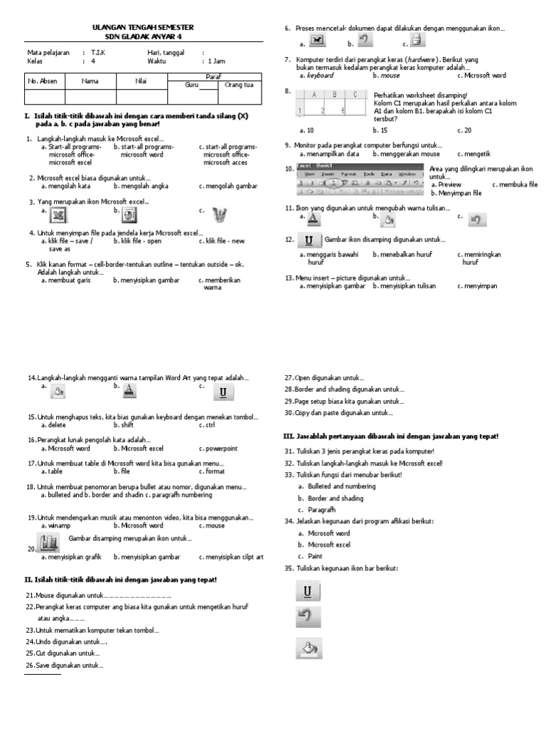 Berikut adalah contoh soal pilihan ganda, isian singkat, dan uraian yang mencakup materi TIK kelas 4 SD semester 2.